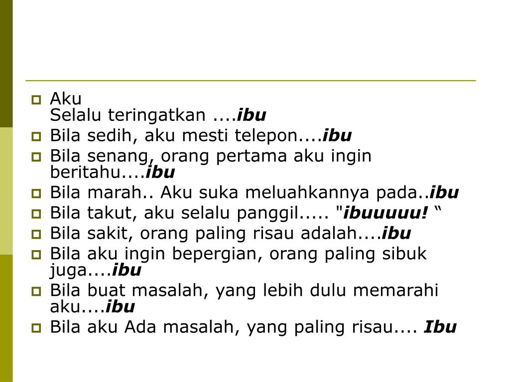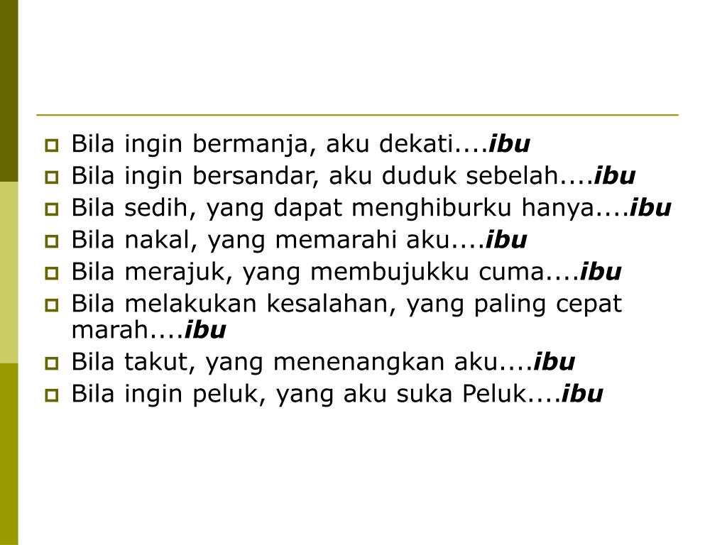 Bila ingin bermanja, aku dekati....ibu • Bila ingin bersandar, aku duduk sebelah....ibu • Bila sedih, yang dapat menghiburku hanya....ibu • Bila nakal, yang memarahi aku....ibu • Bila merajuk, yang membujukku cuma....ibu • Bila melakukan kesalahan, yang paling cepat marah....ibu • Bila takut, yang menenangkan aku....ibu • Bila ingin peluk, yang aku suka Peluk....ibu