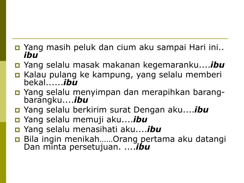 Yang masih peluk dan cium aku sampai Hari ini.. ibu • Yang selalu masak makanan kegemaranku....ibu • Kalau pulang ke kampung, yang selalu memberi bekal......ibu • Yang selalu menyimpan dan merapihkan barang-barangku....ibu • Yang selalu berkirim surat Dengan aku....ibu • Yang selalu memuji aku....ibu • Yang selalu menasihati aku....ibu • Bila ingin menikah……Orang pertama aku datangi Dan minta persetujuan. ....ibu