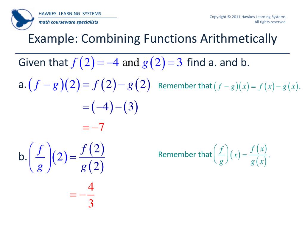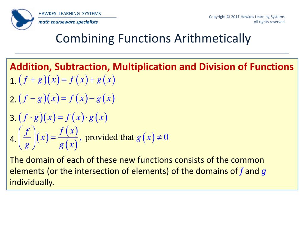 Hawkes Learning Systems: College Algebra. Section 4.5 : Combining Functions. Objectives. Combining functions arithmetically. Composing functions. Decomposing functions. Combining Functions Arithmetically. Addition, Subtraction, Multiplication and Division of Functions 1. 2. 3. 4.