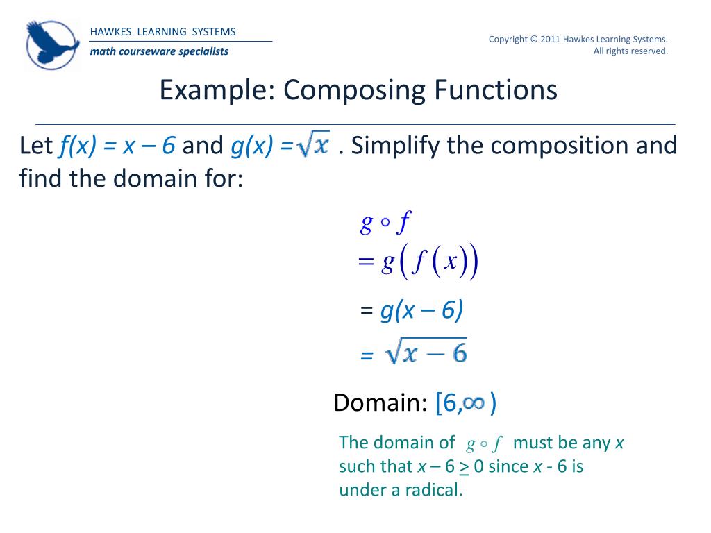Example: Composing Functions Let f(x) = x – 6 and g(x) = . Simplify the composition and find the domain for: = g(x – 6) = Domain: [6, ) The domain of must be any x such that x – 6 > 0 since x - 6 is under a radical.