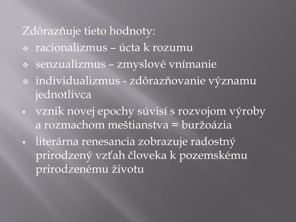 Zdôrazňuje tieto hodnoty: • racionalizmus – úcta k rozumu • senzualizmus – zmyslové vnímanie • individualizmus - zdôrazňovanie významu jednotlivca • vznik novej epochy súvisí s rozvojom výroby a rozmachom meštianstva = buržoázia • literárna renesancia zobrazuje radostný prirodzený vzťah človeka k pozemskému prirodzenému životu