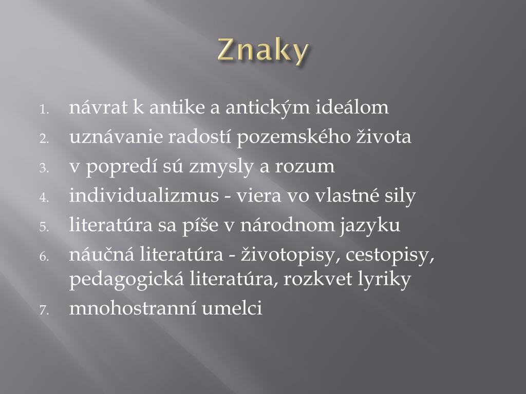 Znaky • návrat k antike a antickým ideálom • uznávanie radostí pozemského života • v popredí sú zmysly a rozum • individualizmus - viera vo vlastné sily • literatúra sa píše v národnom jazyku • náučná literatúra - životopisy, cestopisy, pedagogická literatúra, rozkvet lyriky • mnohostranní umelci