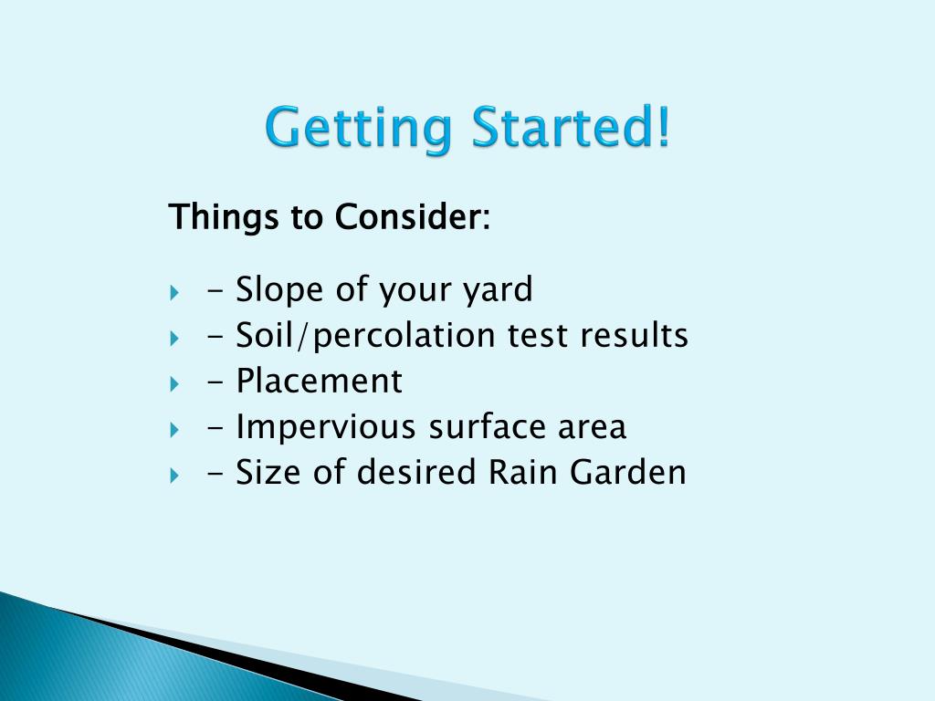 Getting Started! Things to Consider: - Slope of your yard - Soil/percolation test results - Placement - Impervious surface area - Size of desired Rain Garden
