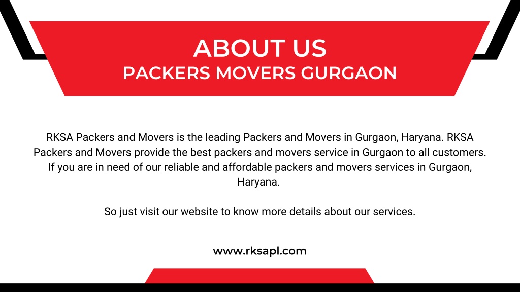 ABOUT US PACKERS MOVERS GURGAON RKSA Packers and Movers is the leading Packers and Movers in Gurgaon, Haryana. RKSA Packers and Movers provide the best packers and movers service in Gurgaon to all customers. If you are in need of our reliable and affordable packers and movers services in Gurgaon, Haryana. So just visit our website to know more details about our services. www.rksapl.com