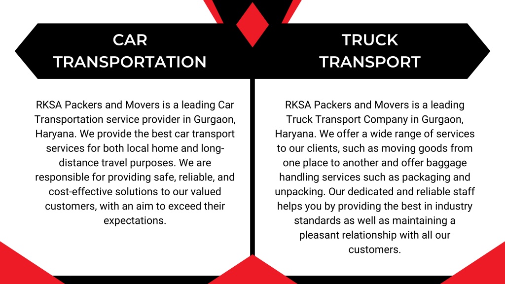 CAR TRUCK TRANSPORT TRANSPORTATION RKSA Packers and Movers is a leading Car Transportation service provider in Gurgaon, Haryana. We provide the best car transport services for both local home and long- distance travel purposes. We are responsible for providing safe, reliable, and cost-effective solutions to our valued customers, with an aim to exceed their expectations. RKSA Packers and Movers is a leading Truck Transport Company in Gurgaon, Haryana. We offer a wide range of services to our clients, such as moving goods from one place to another and offer baggage handling services such as packaging and unpacking. Our dedicated and reliable staff helps you by providing the best in industry standards as well as maintaining a pleasant relationship with all our customers.