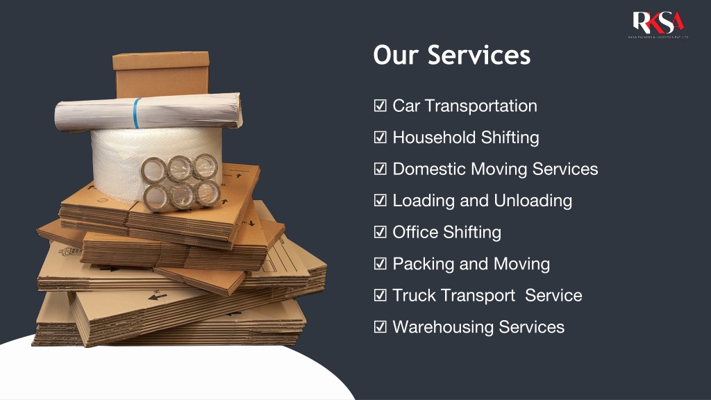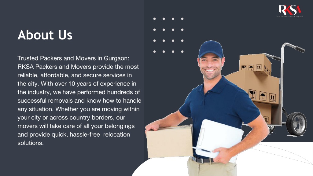 About Us Trusted Packers and Movers in Gurgaon: RKSA Packers and Movers provide the most reliable, affordable, and secure services in the city. With over 10 years of experience in the industry, we have performed hundreds of successful removals and know how to handle any situation. Whether you are moving within your city or across country borders, our movers will take care of all your belongings and provide quick, hassle-free relocation solutions.