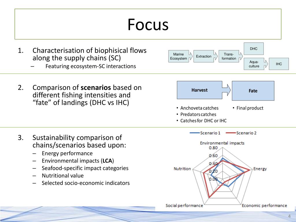 Focus • Characterisation of biophisicalflowsalongthesupplychains (SC) • Featuringecosystem-SC interactions • Comparison of scenariosbasedondifferentfishingintensities and “fate” of landings (DHC vs IHC) • Sustainabilitycomparison of chains/scenariosbasedupon: • Energy performance • Environmentalimpacts (LCA) • Seafood-specificimpactcategories • Nutritionalvalue • Selected socio-economicindicators