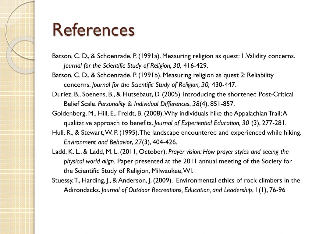 References Batson, C. D., & Schoenrade, P. (1991a). Measuring religion as quest: 1. Validity concerns. Journal for the Scientific Study of Religion, 30, 416-429. Batson, C. D., & Schoenrade, P. (1991b). Measuring religion as quest 2: Reliability concerns. Journal for the Scientific Study of Religion, 30, 430-447. Duriez, B., Soenens, B., & Hutsebaut, D. (2005). Introducing the shortened Post-Critical Belief Scale. Personality & Individual Differences, 38(4), 851-857. Goldenberg, M., Hill, E., Freidt, B. (2008). Why individuals hike the Appalachian Trail; A qualitative approach to benefits. Journal of Experiential Education, 30 (3), 277-281. Hull, R., & Stewart, W. P. (1995). The landscape encountered and experienced while hiking. Environment and Behavior, 27(3), 404-426. Ladd, K. L., & Ladd, M. L. (2011, October). Prayer vision: How prayer styles and seeing the physical world align. Paper presented at the 2011 annual meeting of the Society for the Scientific Study of Religion, Milwaukee, WI. Stuessy, T., Harding, J., & Anderson, J. (2009). Environmental ethics of rock climbers in the Adirondacks. Journal of Outdoor Recreations, Education, and Leadership, 1(1), 76-96