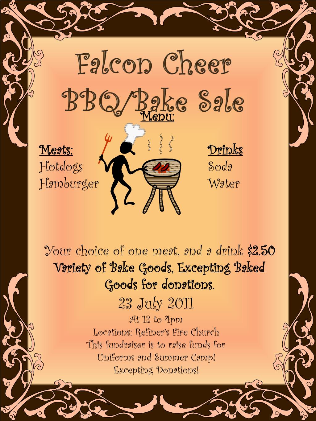 Falcon Cheer BBQ/Bake Sale . Menu: Meats: Drinks Hotdogs Soda Hamburger Water Your choice of one meat, and a drink $2.50 Variety of Bake Goods, Excepting Baked Goods for donations. . 23 July 2011 At 12 to 4pm Locations: Refiner’s Fire Church