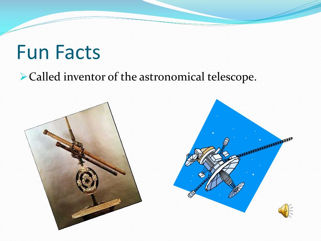 Accomplishments • Invented new hydrostatic balance. • first astronomical telescope. • One of the first people to look at heavens with telescope. • earth round not flat. • Mathematical formulation.