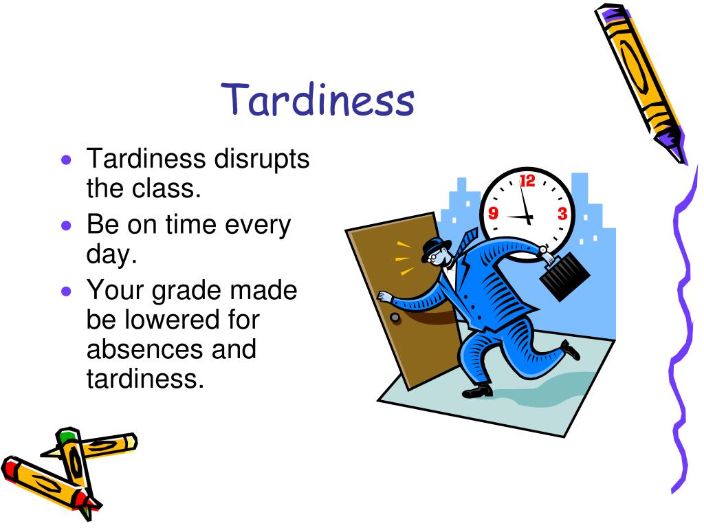 Tardiness • Tardiness disrupts the class. • Be on time every day. • Your grade made be lowered for absences and tardiness.