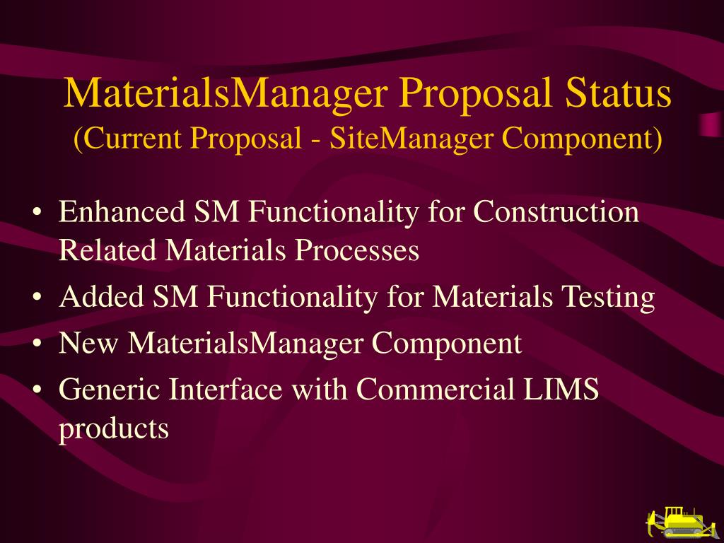 Enhanced SM Functionality for Construction Related Materials Processes Added SM Functionality for Materials Testing New MaterialsManager Component Generic Interface with Commercial LIMS products MaterialsManager Proposal Status (Current Proposal - SiteManager Component)