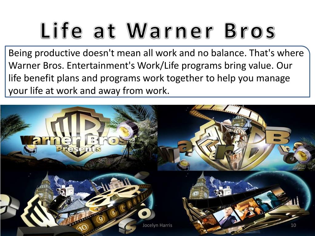 Life at Warner Bros Being productive doesn't mean all work and no balance. That's where Warner Bros. Entertainment's Work/Life programs bring value. Our life benefit plans and programs work together to help you manage your life at work and away from work. Jocelyn Harris