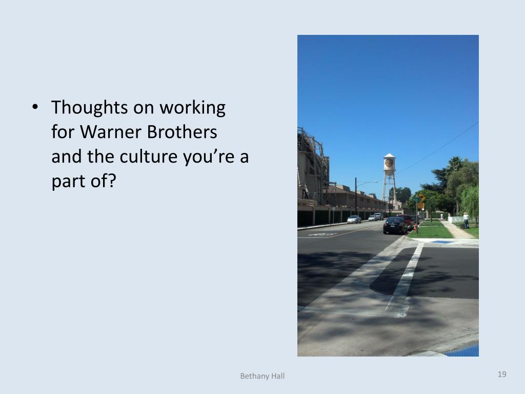 Thoughts on working for Warner Brothers and the culture you’re a part of? 19 Bethany Hall
