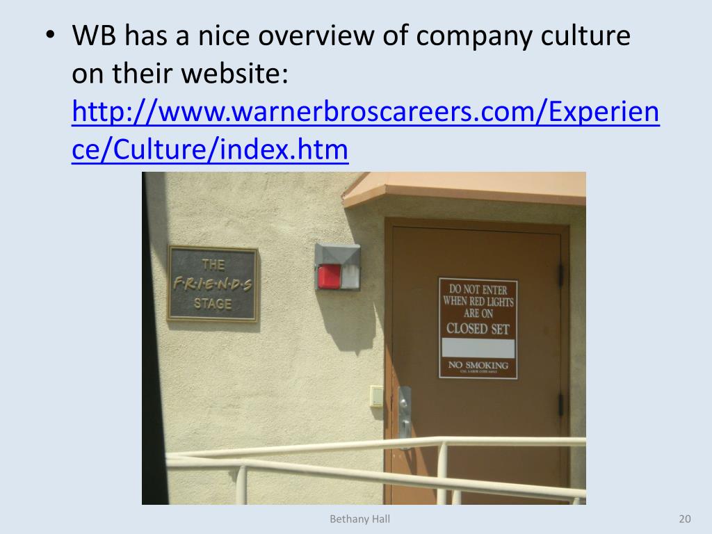 WB has a nice overview of company culture on their website: http://www.warnerbroscareers.com/Experience/Culture/index.htm Bethany Hall 20
