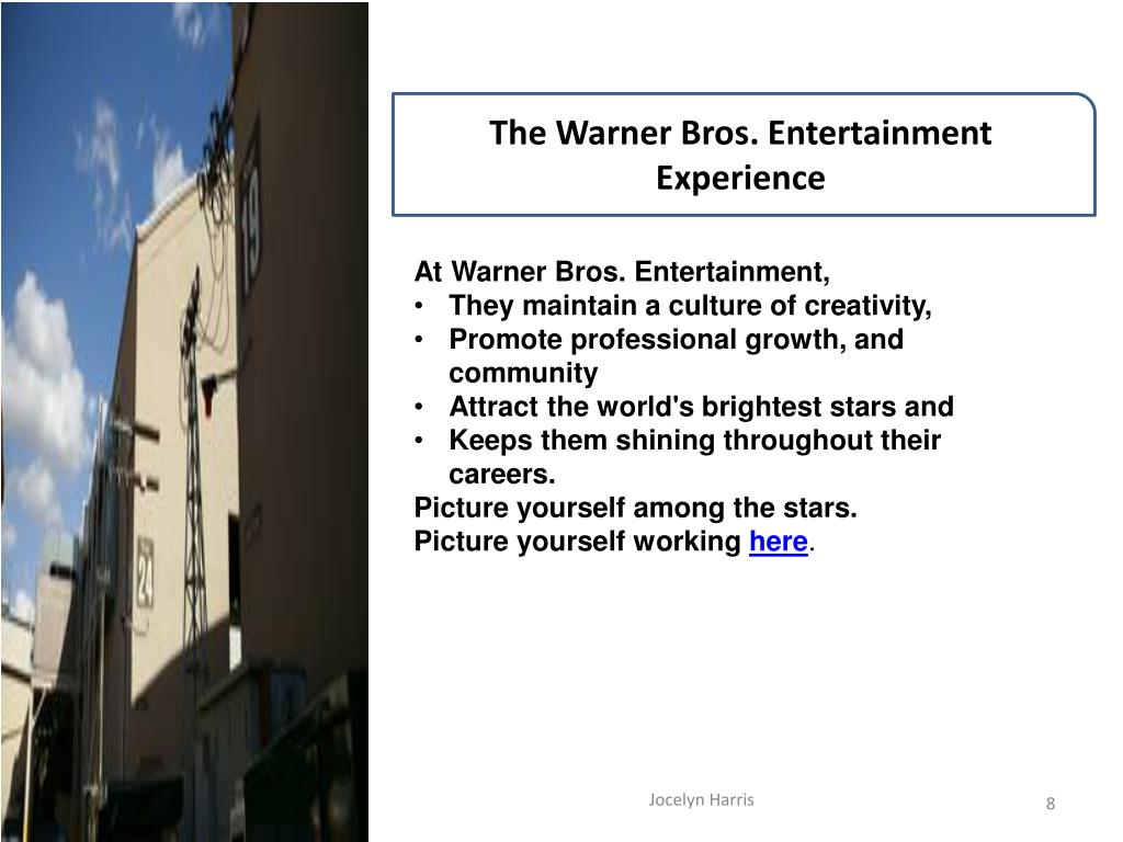 The Warner Bros. Entertainment Experience • At Warner Bros. Entertainment, • They maintain a culture of creativity, • Promote professional growth, and community • Attract the world's brightest stars and • Keeps them shining throughout their careers. Picture yourself among the stars. Picture yourself working here. Jocelyn Harris