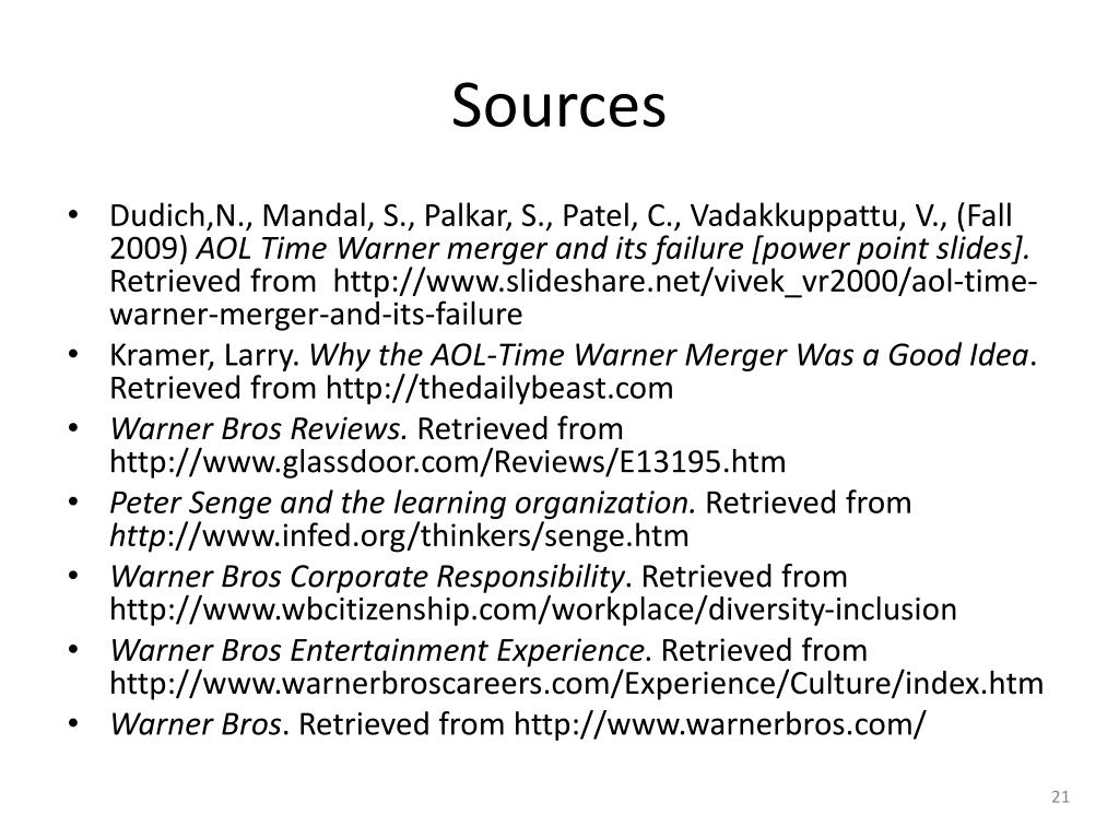 Sources • Dudich,N., Mandal, S., Palkar, S., Patel, C., Vadakkuppattu, V., (Fall 2009) AOL Time Warner merger and its failure [power point slides]. Retrieved from http://www.slideshare.net/vivek_vr2000/aol-time-warner-merger-and-its-failure • Kramer, Larry. Why the AOL-Time Warner Merger Was a Good Idea. Retrieved from http://thedailybeast.com • Warner Bros Reviews. Retrieved from http://www.glassdoor.com/Reviews/E13195.htm • Peter Senge and the learning organization. Retrieved from http://www.infed.org/thinkers/senge.htm • Warner Bros Corporate Responsibility. Retrieved from http://www.wbcitizenship.com/workplace/diversity-inclusion • Warner Bros Entertainment Experience. Retrieved from http://www.warnerbroscareers.com/Experience/Culture/index.htm • Warner Bros. Retrieved from http://www.warnerbros.com/ 21