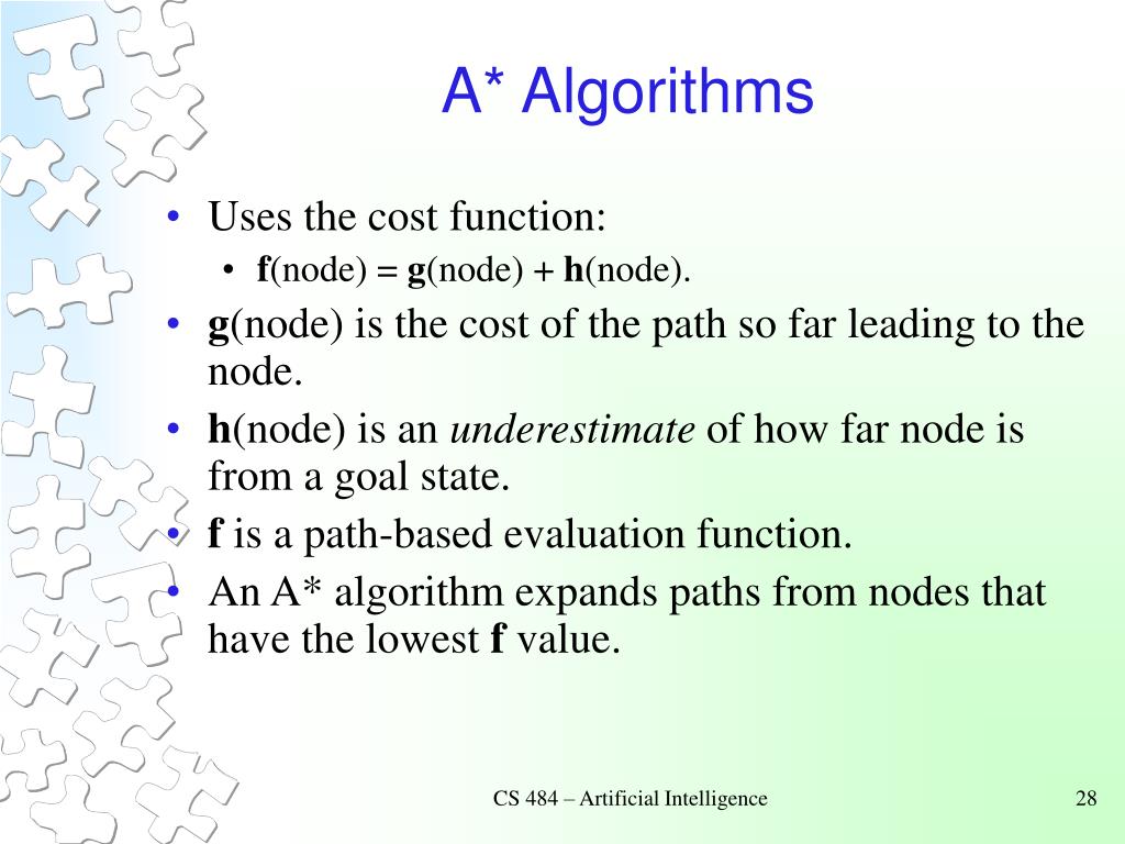 A* Algorithms • Uses the cost function: • f(node) = g(node) + h(node). • g(node) is the cost of the path so far leading to the node. • h(node) is an underestimate of how far node is from a goal state. • f is a path-based evaluation function. • An A* algorithm expands paths from nodes that have the lowest f value. CS 484 – Artificial Intelligence