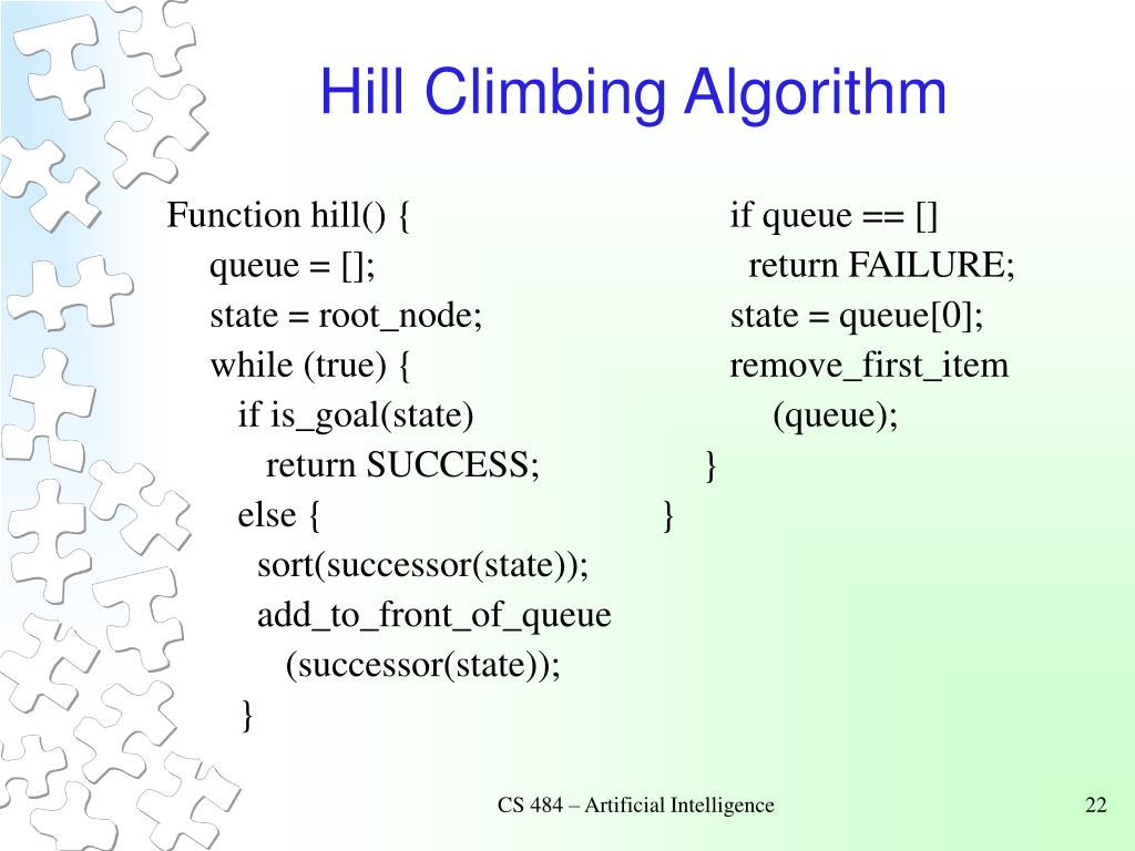 Function hill() { queue = []; state = root_node; while (true) { if is_goal(state) return SUCCESS; else { sort(successor(state)); add_to_front_of_queue (successor(state)); } if queue == [] return FAILURE; state = queue[0]; remove_first_item (queue); } } Hill Climbing Algorithm CS 484 – Artificial Intelligence