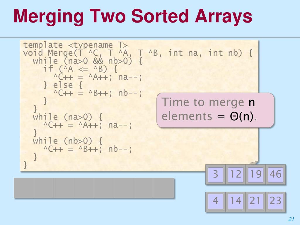 Merging Two Sorted Arrays 3 12 19 46 4 14 21 23 template <typename T> void Merge(T *C, T *A, T *B, intna, intnb) { while (na>0 && nb>0) { if (*A <= *B) { *C++ = *A++; na--; } else { *C++ = *B++; nb--; } } while (na>0) { *C++ = *A++; na--; } while (nb>0) { *C++ = *B++; nb--; } } Time to merge n elements = Θ(n). 3 12 19 46 4 14 21 23