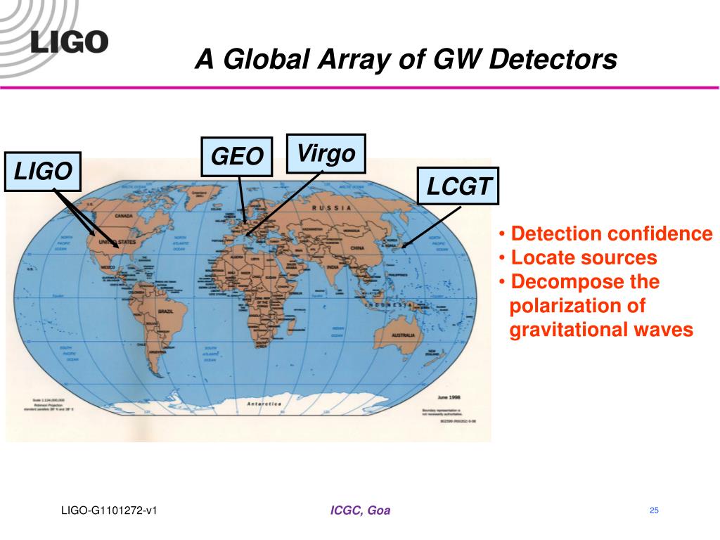 A Global Array of GW Detectors Virgo GEO LIGO LCGT • Detection confidence • Locate sources • Decompose the polarization of gravitational waves ICGC, Goa