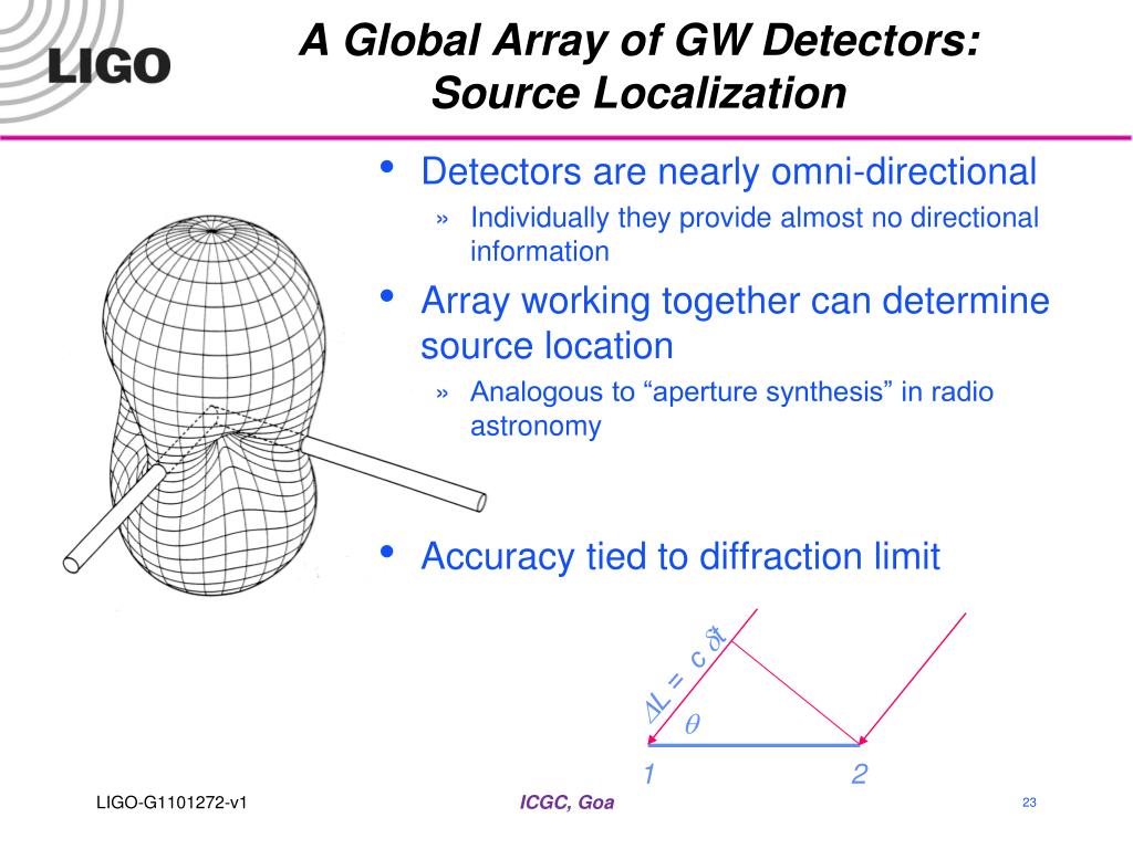 DL = c dt q 1 2 A Global Array of GW Detectors:Source Localization • Detectors are nearly omni-directional • Individually they provide almost no directional information • Array working together can determine source location • Analogous to “aperture synthesis” in radio astronomy • Accuracy tied to diffraction limit ICGC, Goa