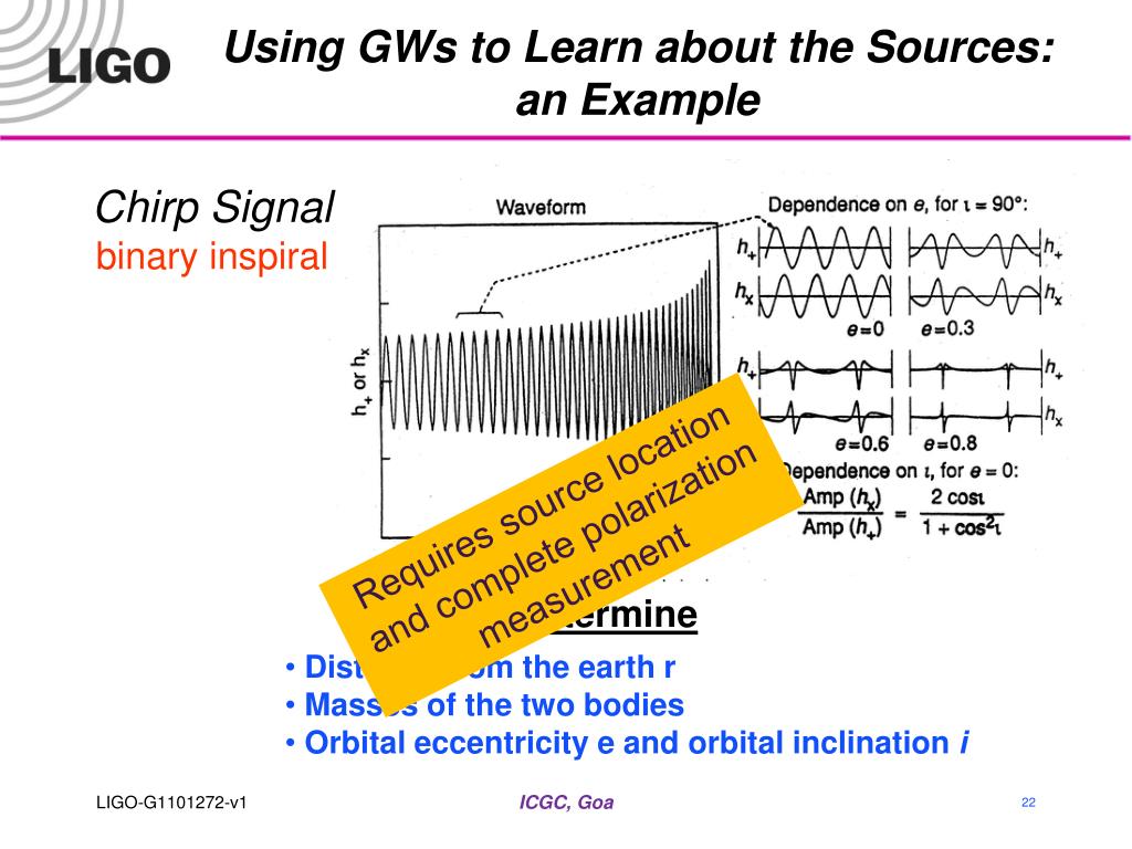 Using GWs to Learn about the Sources:an Example Chirp Signalbinary inspiral Requires source location and complete polarization measurement Can determine • Distance from the earth r • Masses of the two bodies • Orbital eccentricity e and orbital inclination i ICGC, Goa