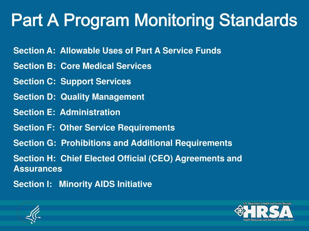 Part A Program Monitoring Standards Section A: Allowable Uses of Part A Service Funds Section B: Core Medical Services Section C: Support Services Section D: Quality Management Section E: Administration Section F: Other Service Requirements Section G: Prohibitions and Additional Requirements Section H: Chief Elected Official (CEO) Agreements and Assurances Section I: Minority AIDS Initiative