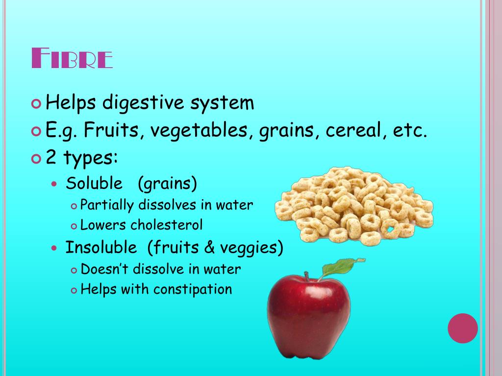 Fibre • Helps digestive system • E.g. Fruits, vegetables, grains, cereal, etc. • 2 types: • Soluble (grains) • Partially dissolves in water • Lowers cholesterol • Insoluble (fruits & veggies) • Doesn’t dissolve in water • Helps with constipation