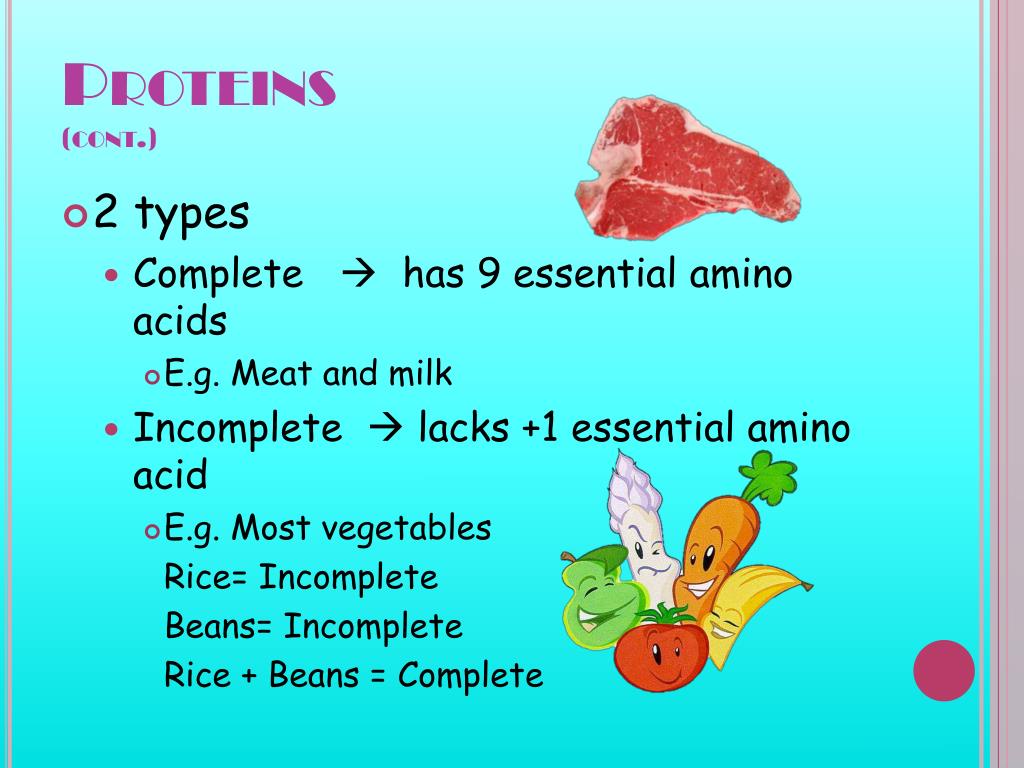 Proteins(cont.) • 2 types • Complete has 9 essential amino acids • E.g. Meat and milk • Incomplete lacks +1 essential amino acid • E.g. Most vegetables Rice= Incomplete Beans= Incomplete Rice + Beans = Complete