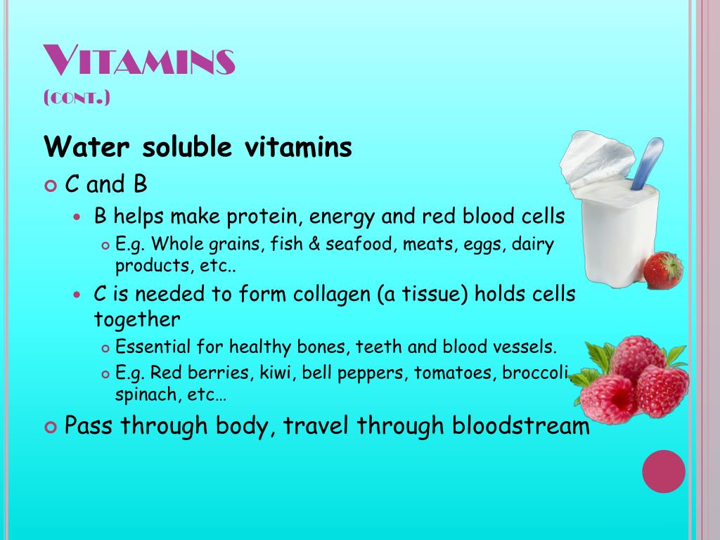 Vitamins(cont.) Water soluble vitamins • C and B • B helps make protein, energy and red blood cells • E.g. Whole grains, fish & seafood, meats, eggs, dairy products, etc.. • C is needed to form collagen (a tissue) holds cells together • Essential for healthy bones, teeth and blood vessels. • E.g. Red berries, kiwi, bell peppers, tomatoes, broccoli, spinach, etc… • Pass through body, travel through bloodstream