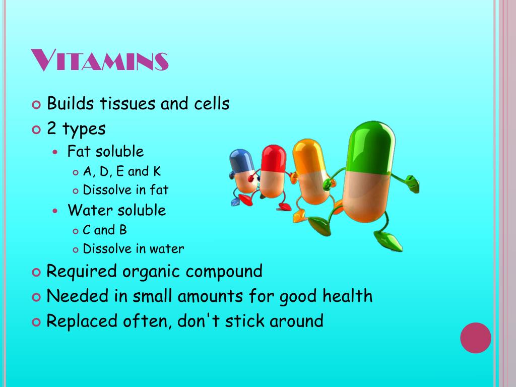 Vitamins • Builds tissues and cells • 2 types • Fat soluble • A, D, E and K • Dissolve in fat • Water soluble • C and B • Dissolve in water • Required organic compound • Needed in small amounts for good health • Replaced often, don't stick around