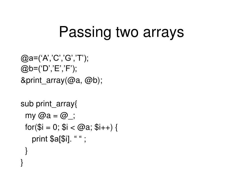 Passing two arrays @a=(‘A’,’C’,’G’,’T’); @b=(‘D’,’E’,’F’); &print_array(@a, @b); sub print_array{ my @a = @_; for($i = 0; $i < @a; $i++) { print $a[$i]. “ “ ; } }