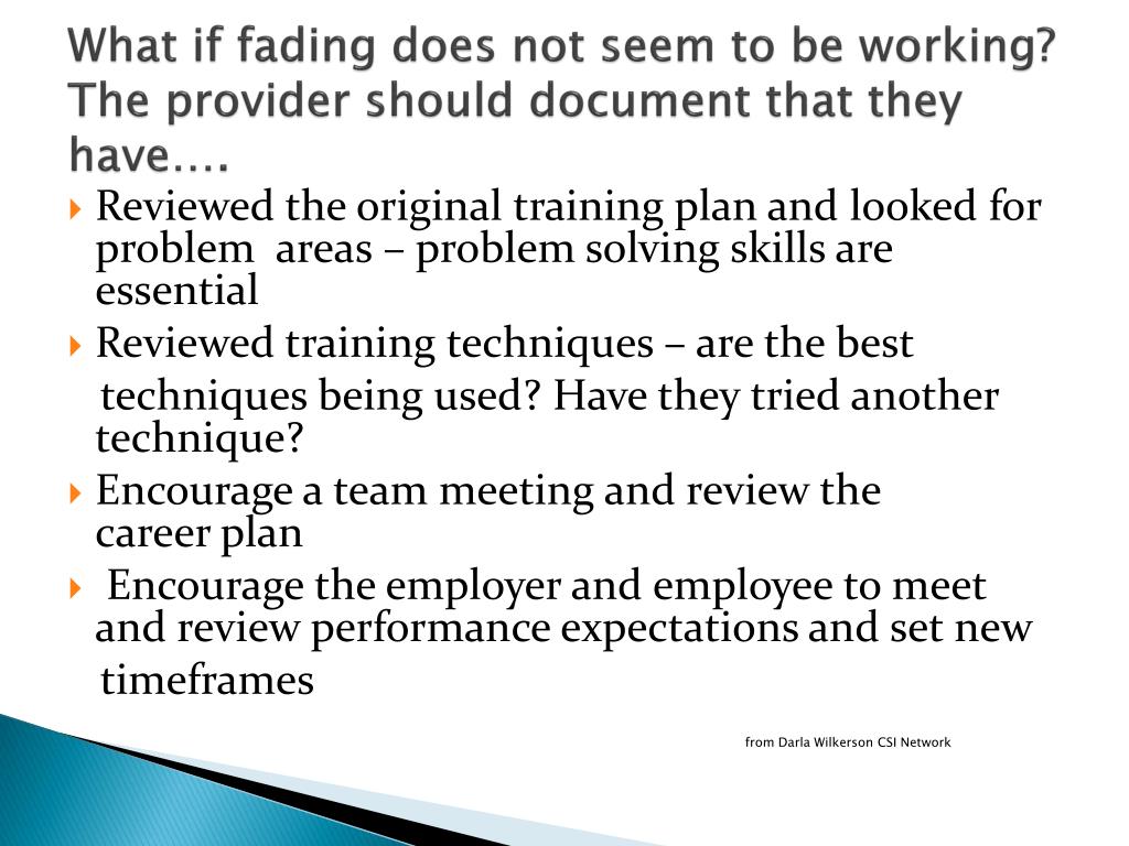 What if fading does not seem to be working? The provider should document that they have…. • Reviewed the original training plan and looked for problem areas – problem solving skills are essential • Reviewed training techniques – are the best techniques being used? Have they tried another technique? • Encourage a team meeting and review the career plan • Encourage the employer and employee to meet and review performance expectations and set new timeframes from Darla Wilkerson CSI Network