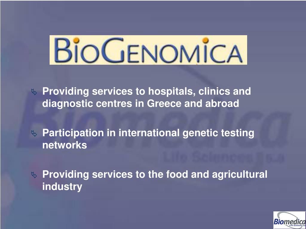 Providing services to hospitals, clinics and diagnostic centres in Greece and abroad • Participation in international genetic testing networks • Providing services to the food and agricultural industry