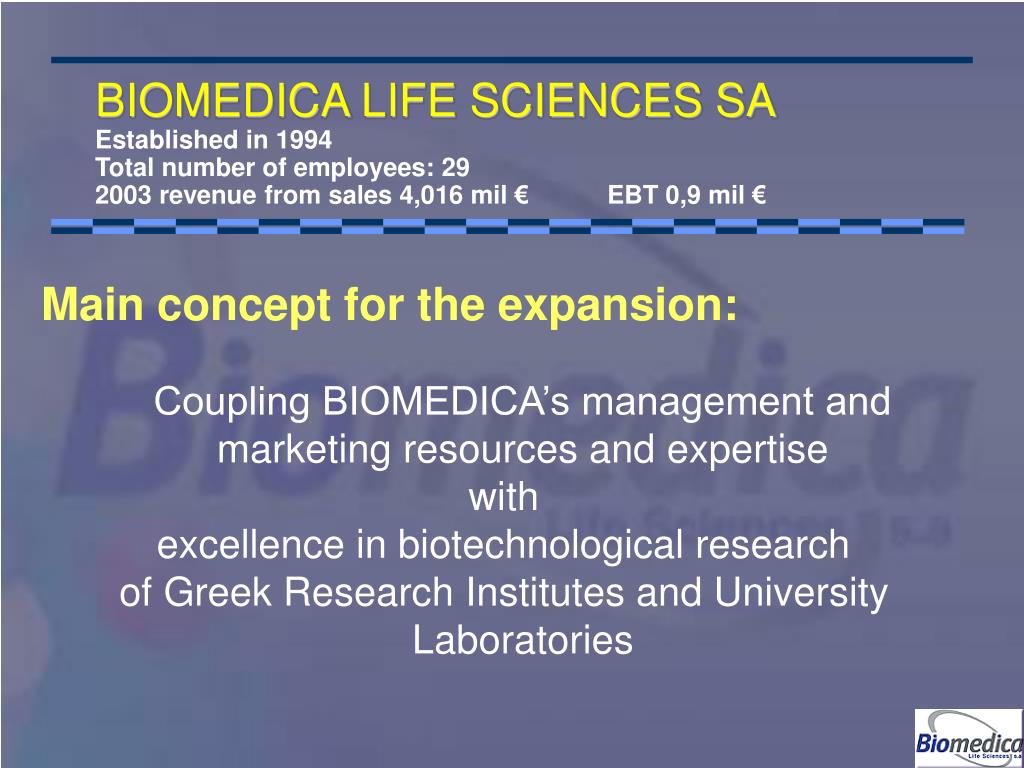 BIOMEDICA LIFE SCIENCES SAEstablished in 1994Total number of employees: 29 2003revenue from sales 4,016 mil € EBT 0,9 mil € Coupling BIOMEDICA’s management and marketing resources and expertise with excellence in biotechnological research of Greek Research Institutes and University Laboratories Main concept for the expansion: