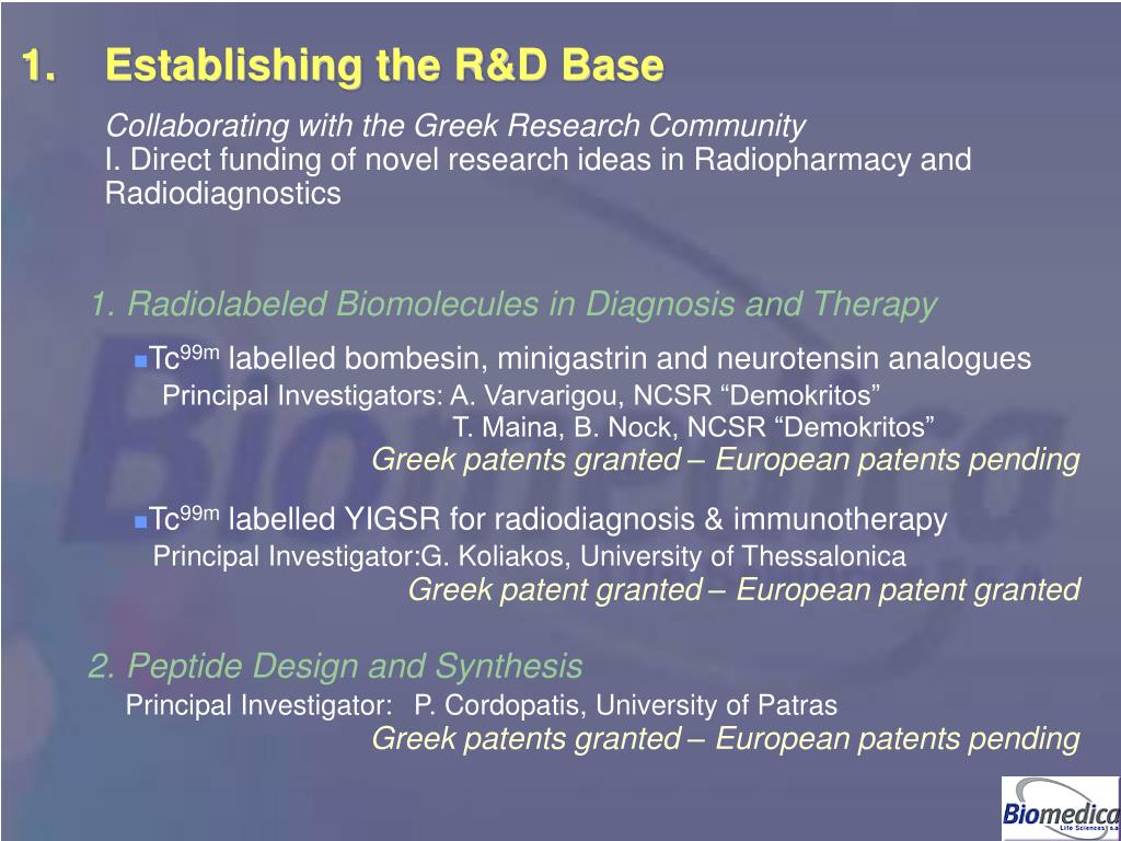 Establishing the R&D BaseCollaborating with the Greek Research CommunityI. Direct funding of novel research ideas in Radiopharmacy and Radiodiagnostics 1. Radiolabeled Biomolecules in Diagnosis and Therapy • Tc99m labelled bombesin, minigastrin and neurotensin analogues Principal Investigators: A. Varvarigou, NCSR “Demokritos” T. Maina, B. Nock, NCSR “Demokritos” Greek patents granted – European patents pending • Tc99m labelled YIGSR for radiodiagnosis & immunotherapy Principal Investigator:G. Koliakos, University of Thessalonica Greek patent granted – European patent granted 2. Peptide Design and Synthesis Principal Investigator: P. Cordopatis, University of Patras Greek patents granted – European patents pending