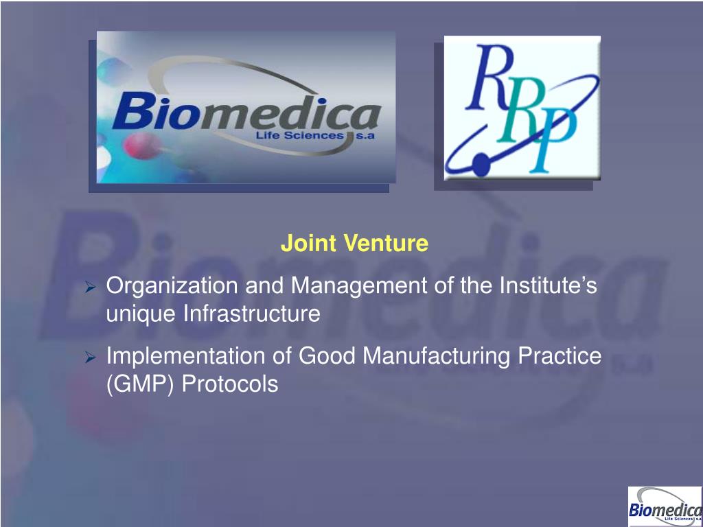 Joint Venture • Organization and Management of the Institute’s unique Infrastructure • Implementation of Good Manufacturing Practice (GMP) Protocols