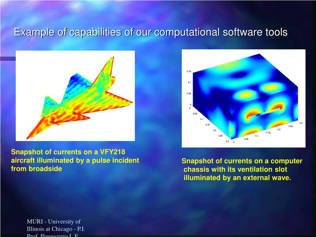 Example of capabilities of our computational software tools Snapshot of currents on a VFY218 aircraft illuminated by a pulse incident from broadside Snapshot of currents on a computer chassis with its ventilation slot illuminated by an external wave.