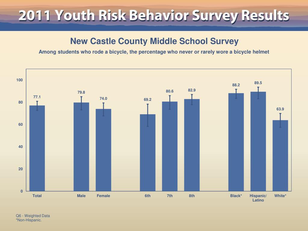 New Castle County Middle School Survey. Among students who rode a bicycle, the percentage who never or rarely wore a bicycle helmet. Q6 - Weighted Data. *Non-Hispanic. New Castle County Middle School Survey.