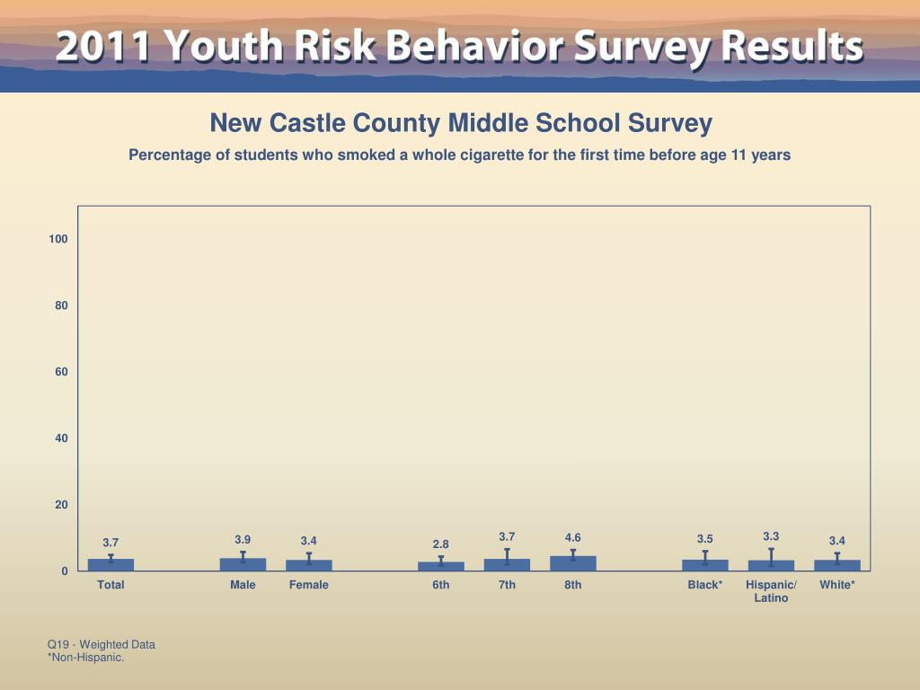 New Castle County Middle School Survey Percentage of students who smoked a whole cigarette for the first time before age 11 years Q19 - Weighted Data *Non-Hispanic.