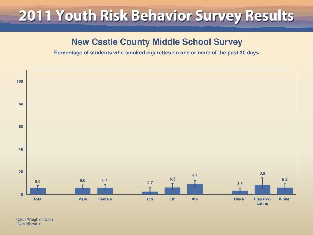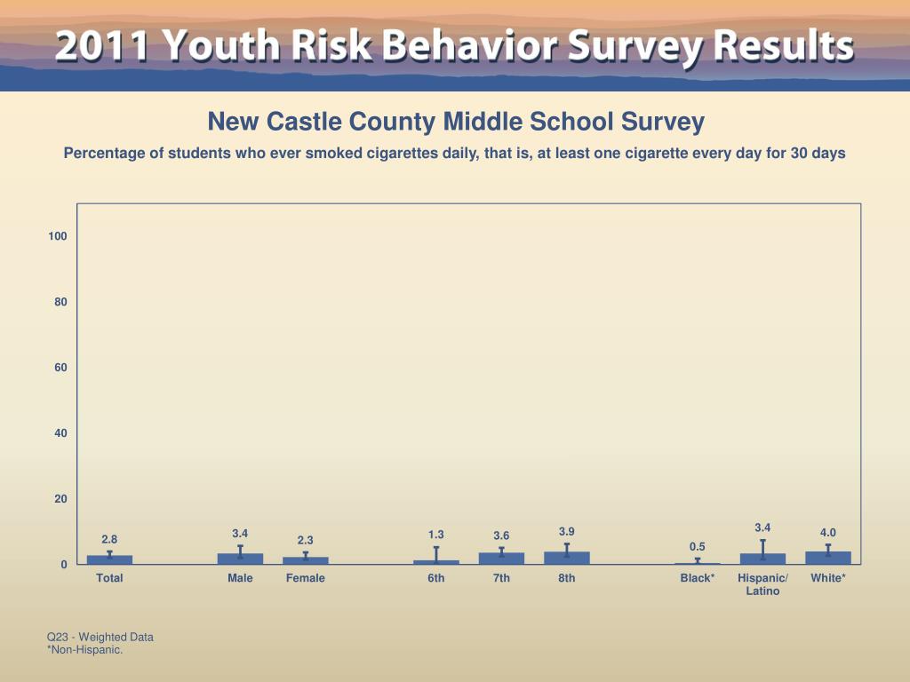 New Castle County Middle School Survey Percentage of students who ever smoked cigarettes daily, that is, at least one cigarette every day for 30 days Q23 - Weighted Data *Non-Hispanic.