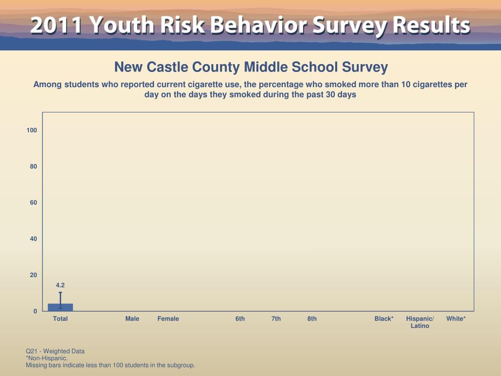 New Castle County Middle School Survey Among students who reported current cigarette use, the percentage who smoked more than 10 cigarettes per day on the days they smoked during the past 30 days Q21 - Weighted Data *Non-Hispanic. Missing bars indicate less than 100 students in the subgroup.