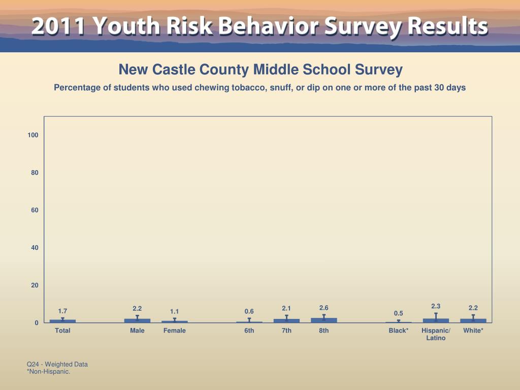New Castle County Middle School Survey Percentage of students who used chewing tobacco, snuff, or dip on one or more of the past 30 days Q24 - Weighted Data *Non-Hispanic.