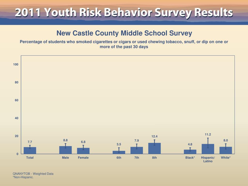 New Castle County Middle School Survey Percentage of students who smoked cigarettes or cigars or used chewing tobacco, snuff, or dip on one or more of the past 30 days QNANYTOB - Weighted Data *Non-Hispanic.