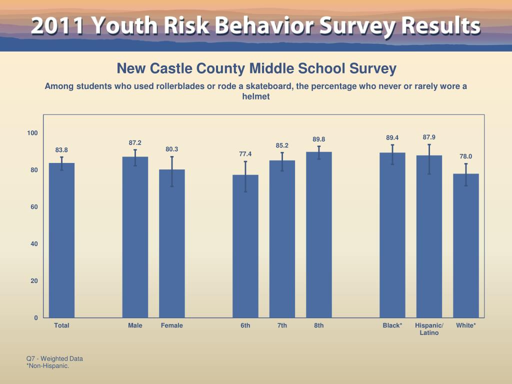 New Castle County Middle School Survey Among students who used rollerblades or rode a skateboard, the percentage who never or rarely wore a helmet Q7 - Weighted Data *Non-Hispanic.
