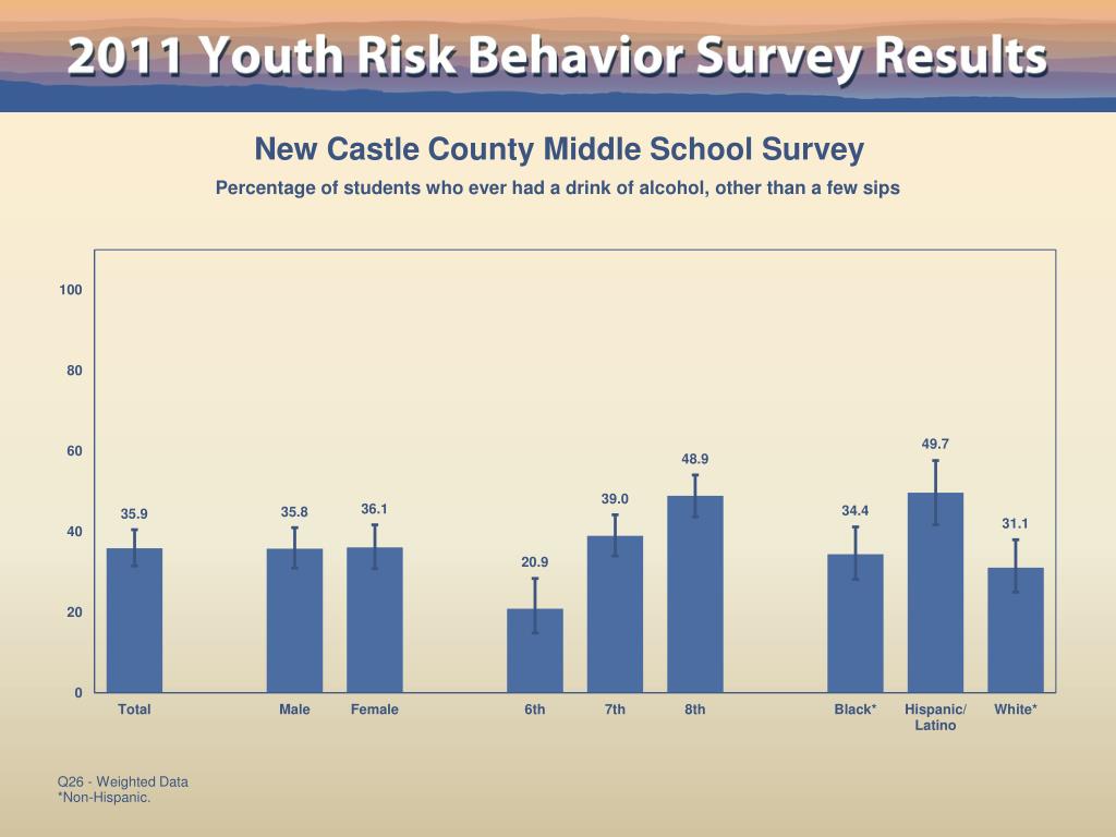 New Castle County Middle School Survey Percentage of students who ever had a drink of alcohol, other than a few sips Q26 - Weighted Data *Non-Hispanic.