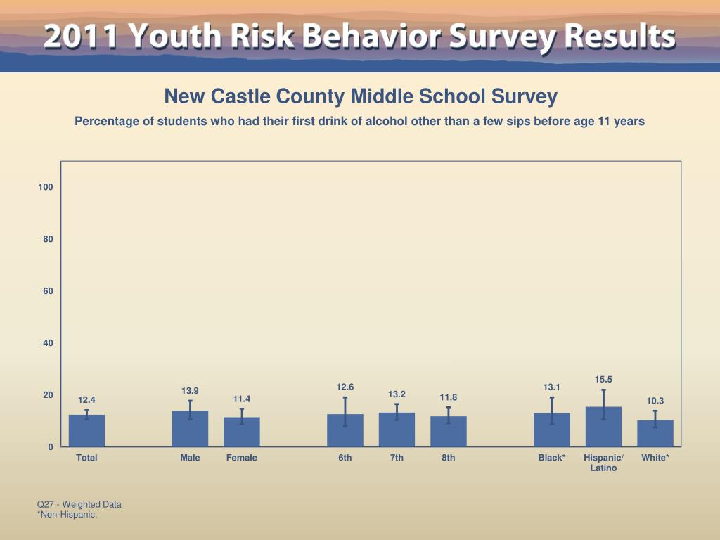 New Castle County Middle School Survey Percentage of students who had their first drink of alcohol other than a few sips before age 11 years Q27 - Weighted Data *Non-Hispanic.