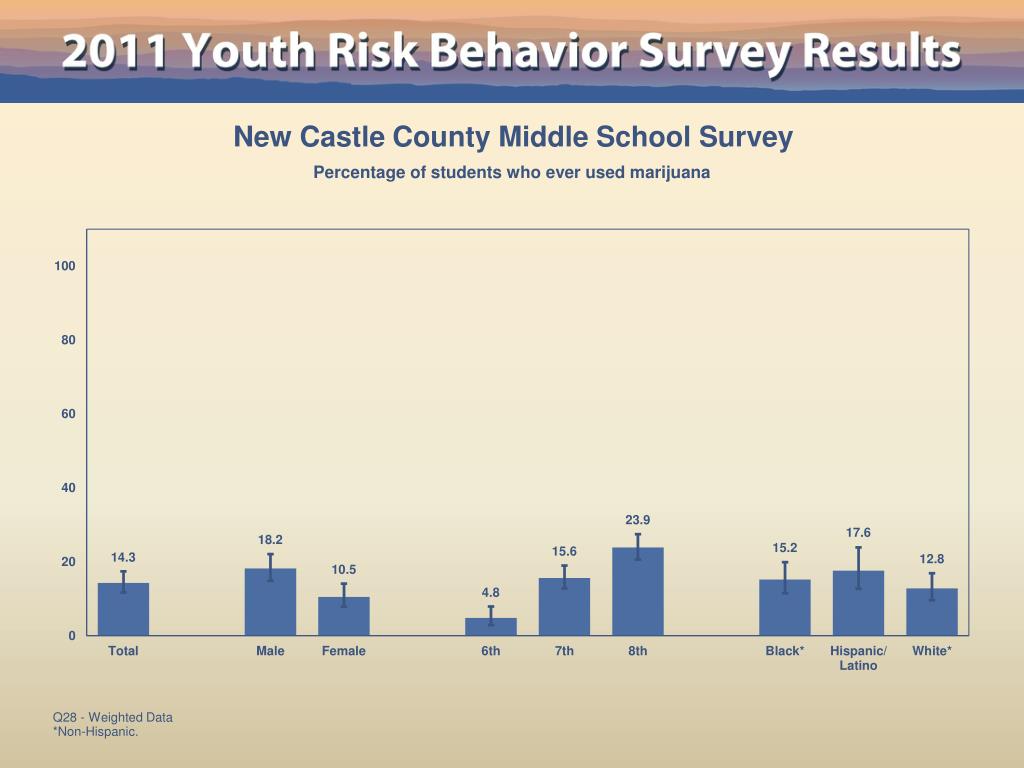 New Castle County Middle School Survey Percentage of students who ever used marijuana Q28 - Weighted Data *Non-Hispanic.