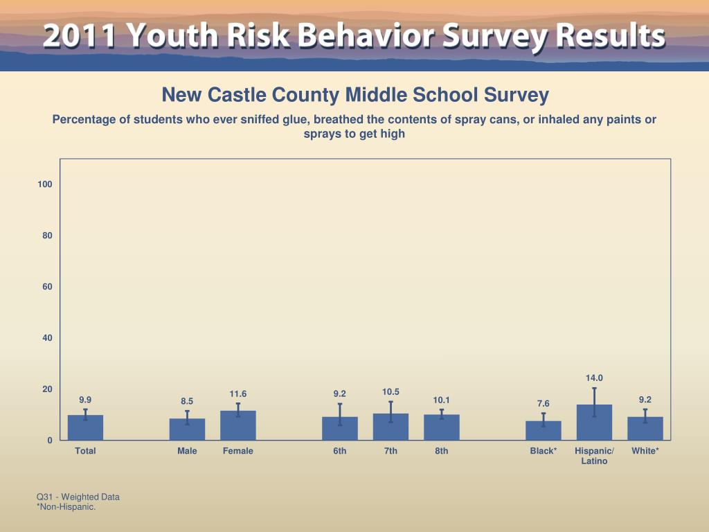 New Castle County Middle School Survey Percentage of students who ever sniffed glue, breathed the contents of spray cans, or inhaled any paints or sprays to get high Q31 - Weighted Data *Non-Hispanic.